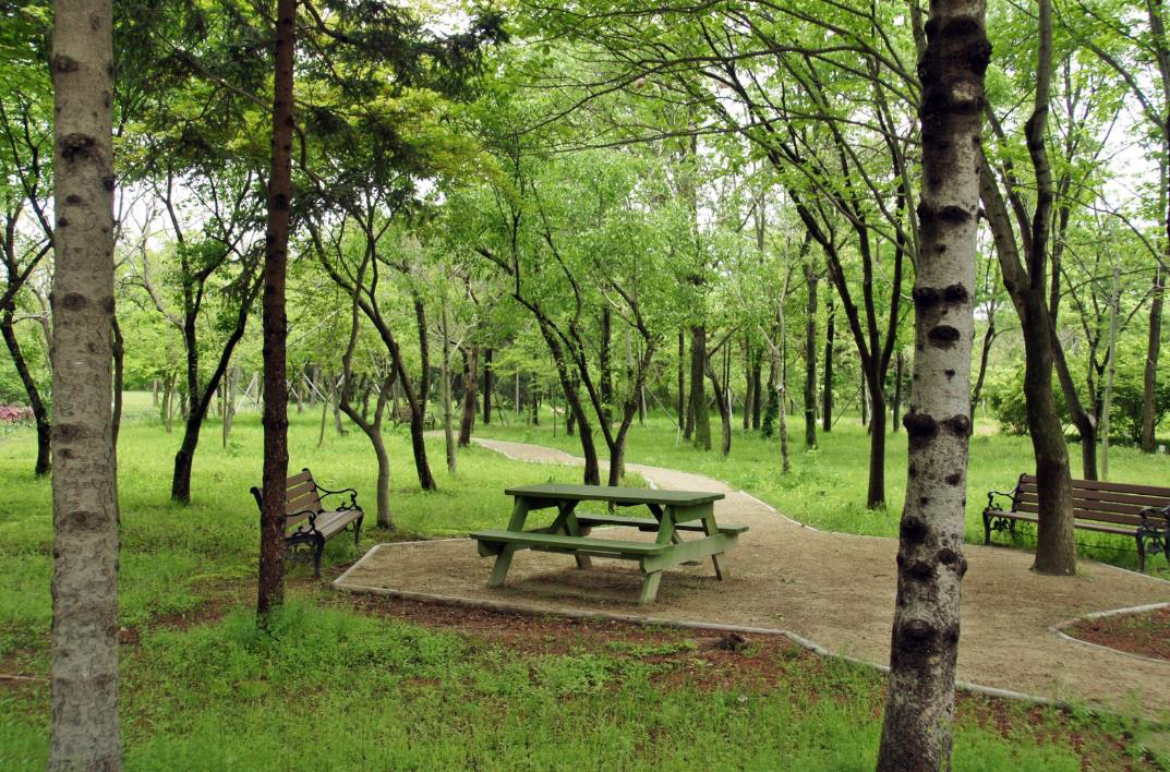 서쪽 영역에는 피크닉 테이블과 정자, 숲길이 조성되어 있어 쉬어가기 좋은 포인트입니다.
