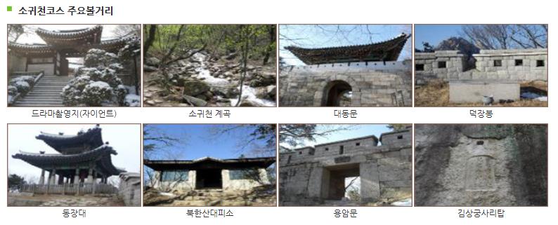 북한산 소귀천 코스를 시작하면 바로 눈앞에서 제법 사람크기 만한 갖가지 형상을 한 바위들과 온갖 아름다운 산새들의 울음소리, 계곡 물 흐르는 소리 등 도심에서 볼 수 없었던 것들이 탐방객을 매료시키기에 충분하다. 또한 수원이 더욱 풍부해지는 여름철 계곡과 함께 북한산성의 성문들을 탐방하는 것도 추천합니다.