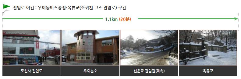 우이동버스종점에서 소귀천 코스 진입로까지는 약 1.1km의 아스팔트길이 기다리고 있다. 대형의류매장과 삼양교통 사이의 도로를 따라 가다보면 3.1운동의 진원지인 봉황각에 다다르게 된다. 봉황각 맞은편에는 북한산국립공원 우이분소 사무실이 위치하고 있다.