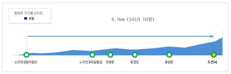 - 소귀천공원지킴터에서 대동문, 동장대, 용암문, 도선사에 이르는 탐방코스로 편도 5.1km, 소요시간은 3시간 10분입니다.