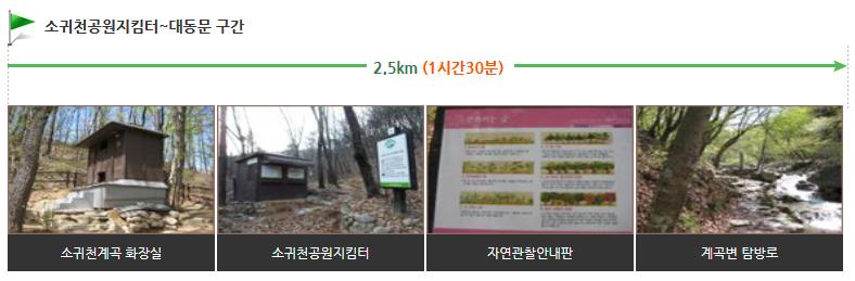 소귀천공원지킴터~대동문 구간은 약 2.5km, 1시간 30분 정도 소요된다. 사람만한 진귀한 바위들이 있는 계곡길을 따라 탐방로가 조성되어 있으며 흙길과 자연 상태의 돌길이 반복되는 비교적 경사가 완만한 탐방로 이다.