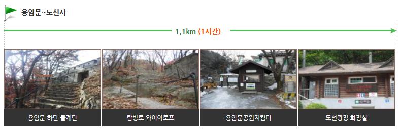 용암문~도선사 구간은 구간은 약 1.1km, 1시간 정도 소요된다. 용암문을 통과하면 바로 가파른 돌계단 길로 이어지며 길 폭이 좁고 비교적 경사가 있는 구간과 완경사길이 혼합된 코스로 하단 일부에서는 계곡과 맞닿게 되는 탐방로이다.
